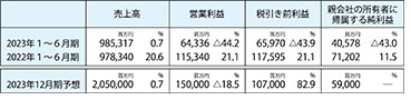 AGC(平井良典社長)は8月2日、2023年1〜6月期決算を発表した。売上高は9853億1700万円、2022年同期比0.7%増。営業利益は643億3600万円、同44.2%減、税引き前利益は659億7000万円、同43.9%減、親会社の所有者に帰属する純利益は405億7800万円、同43.0%減となった。