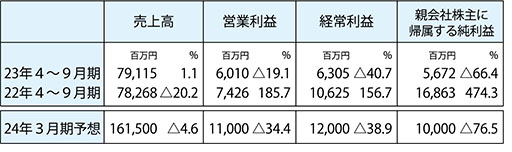 セントラル硝子(前田一彦社長)は11月6日、2023年4〜9月期の連結決算を発表した。売上高は791億1500万円、2022年同期比1.1%増。営業利益は60億1000万円、同19.1%減、経常利益は63億500万円、同40.7%減、親会社株主に帰属する純利益は56億7200万円、同66.4%減だった。ガラス事業は増収減益となった。