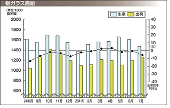 一般社団法人板硝子協会(森重樹会長)は10月1日、2025年7月の板ガラス生産・出荷動向を発表。前年同月比で板ガラスの生産は3カ月連続の増加から減少に転じた。出荷は3カ月連続で減少。複層ガラスは生産・出荷とも6カ月連続減。合わせガラスは生産・出荷とも先月の増加が減少に転じた。出荷のうち建築用は9カ月連続の増加。強化ガラスの生産は先月の増加が減少に転じ、出荷は3カ月連続で減少した。板ガラスの生産は146万9000換算箱、2024年同月比11.4%減。出荷は126万1000換算箱、同5.7%減。